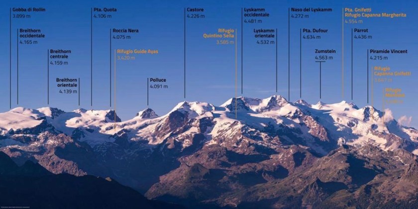 De volgende ochtend zitten we aan de koffie bij het barretje om de hoek. We genieten nog na van de wandeling, maar ik heb nog steeds geen zekerheid. Ik laat mijn wazige ingezoomde iPad foto van ons uitzicht in Ponti aan het personeel zien. “Sorry, I don’t know for sure, but Alessandro knows and he will be here in a few minutes”. Vijf minuten later arriveert Alessandro. Naast bareigenaar, is hij berggids en reddingswerker. Hij heeft zo meteen een klimexamen maar heeft wel even tijd om naar mijn scherm te kijken. Met kloppend hart toon ik hem de foto. Alessandro herkent de silhouetten van de bergkammen direct. “On the left is Castore, in the middle the two Lyskamms and on the right the Gnifetti peak. Behind that peak you can see the Dufourspitze”. Ik ben met stomheid geslagen. Hij beschrijft het complete Monte Rosamassief! Zeer voldaan rijden we terug naar Ponti, nog 200 kilometer….